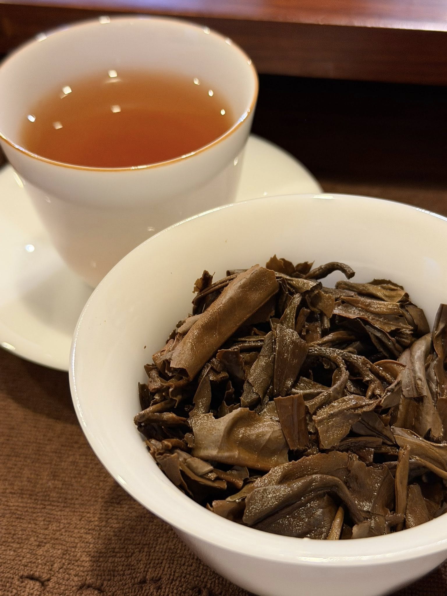 After brewing, the tea liquor is an oily, bright orange-red. Upon entry, the flavor is strong, mellow, and substantially thick. The soup has a heavy texture, and the saliva production (生津, shēng jīn) and returning sweetness (回甘, huí gān) are rapid. The distinctive sweet and smooth quality of Ban Zhang tea gives the liquor impressive tension and fullness.