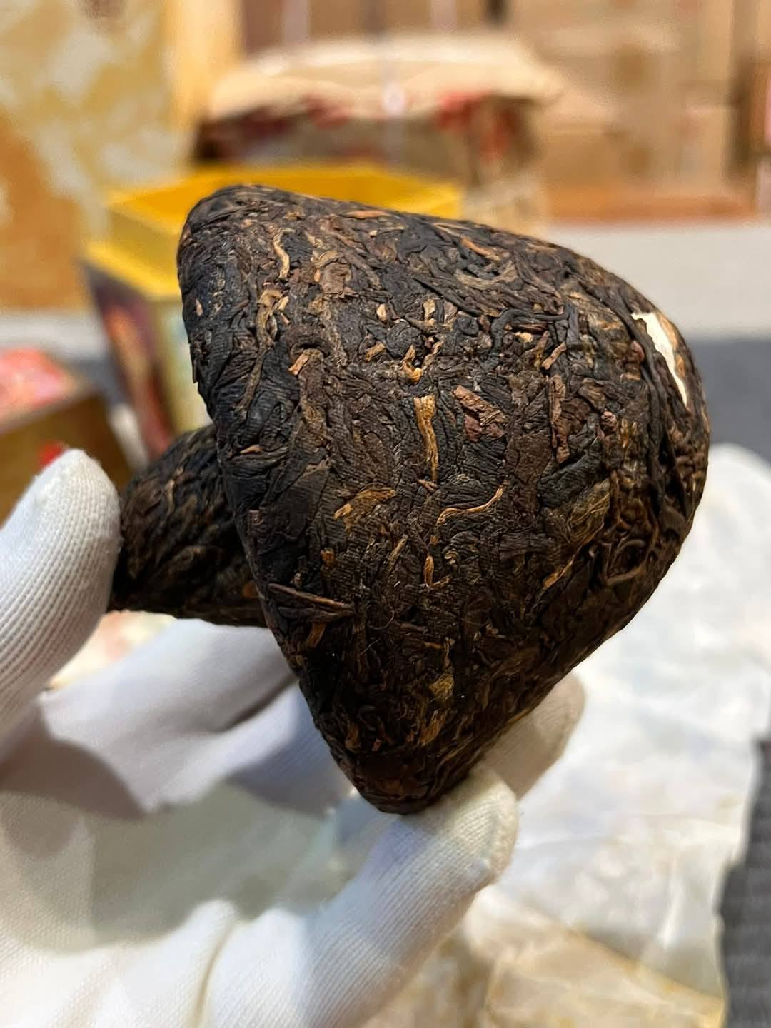 - Appearance: The tea is tightly compressed into a perfect mushroom shape, with clearly distinct leaf strips.